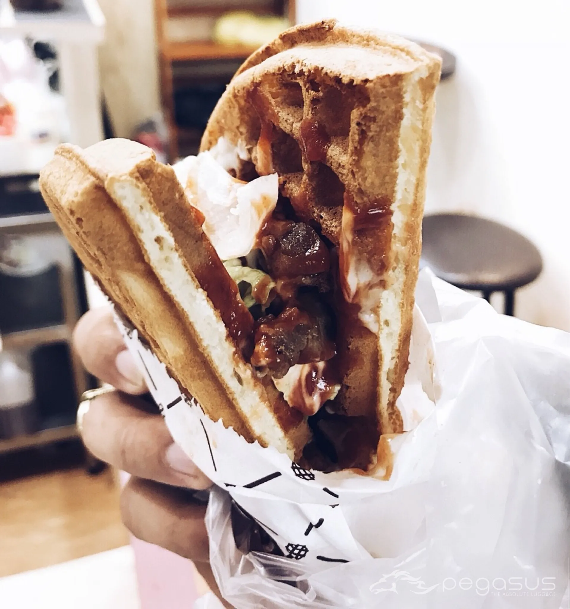 ได้วาฟเฟิลไก่มา รสชาติแบบบาบีคิวๆ อร่อย เข้ากับวาฟเฟิลที่ออกหวานหน่อย